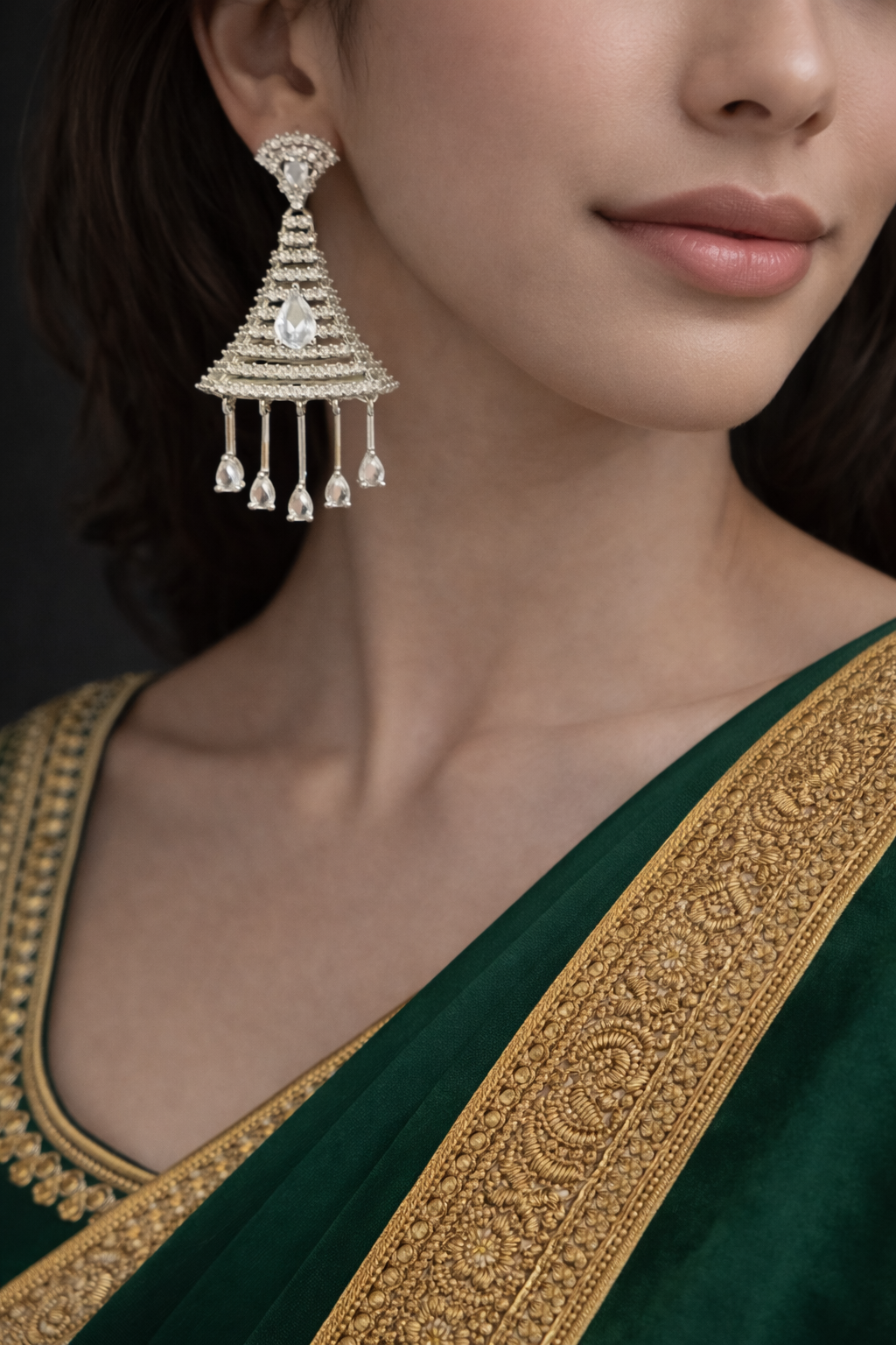 Redefine modern elegance with Nexli’s Crystal Cascade Silver-Tone American Diamond Statement Earrings. Designed with a structured, geometric silhouette, these earrings feature layered rows of high-brilliance American diamonds that create depth, symmetry, and refined sparkle.