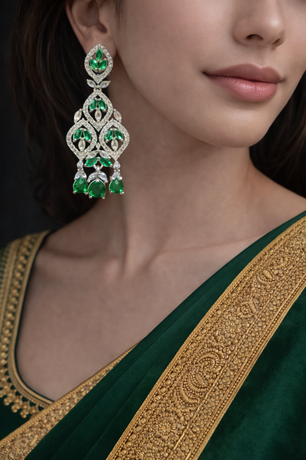 The intricate arrangement creates a balanced sparkle from top to bottom, finishing with a bold emerald drop that adds movement and a luxurious touch. Finished in a polished silver tone, this piece blends modern elegance with classic charm — perfect for receptions, cocktail parties, and high-end celebrations.