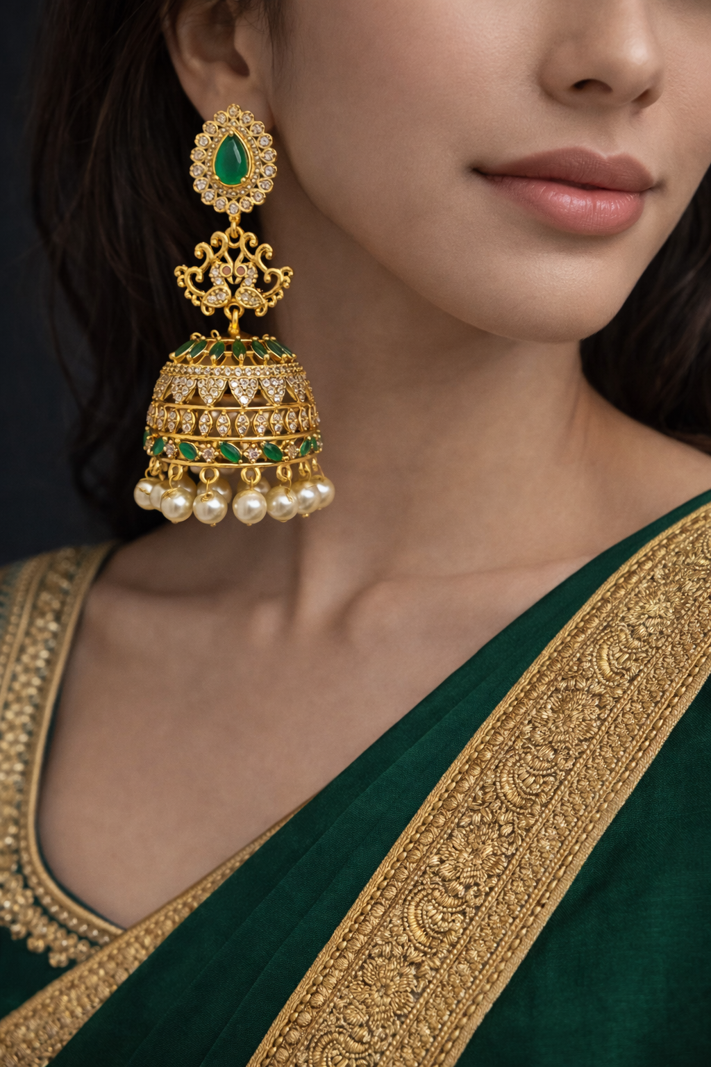 Step into timeless elegance with Nexli’s Emerald Pearl Drop American Diamond Bridal Jhumka, crafted for weddings and high-occasion wear. These statement jhumkas are designed with a layered dome structure adorned with high-quality American diamonds and highlighted by vibrant emerald-green stones that add a regal touch.