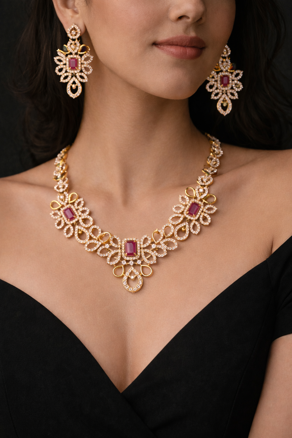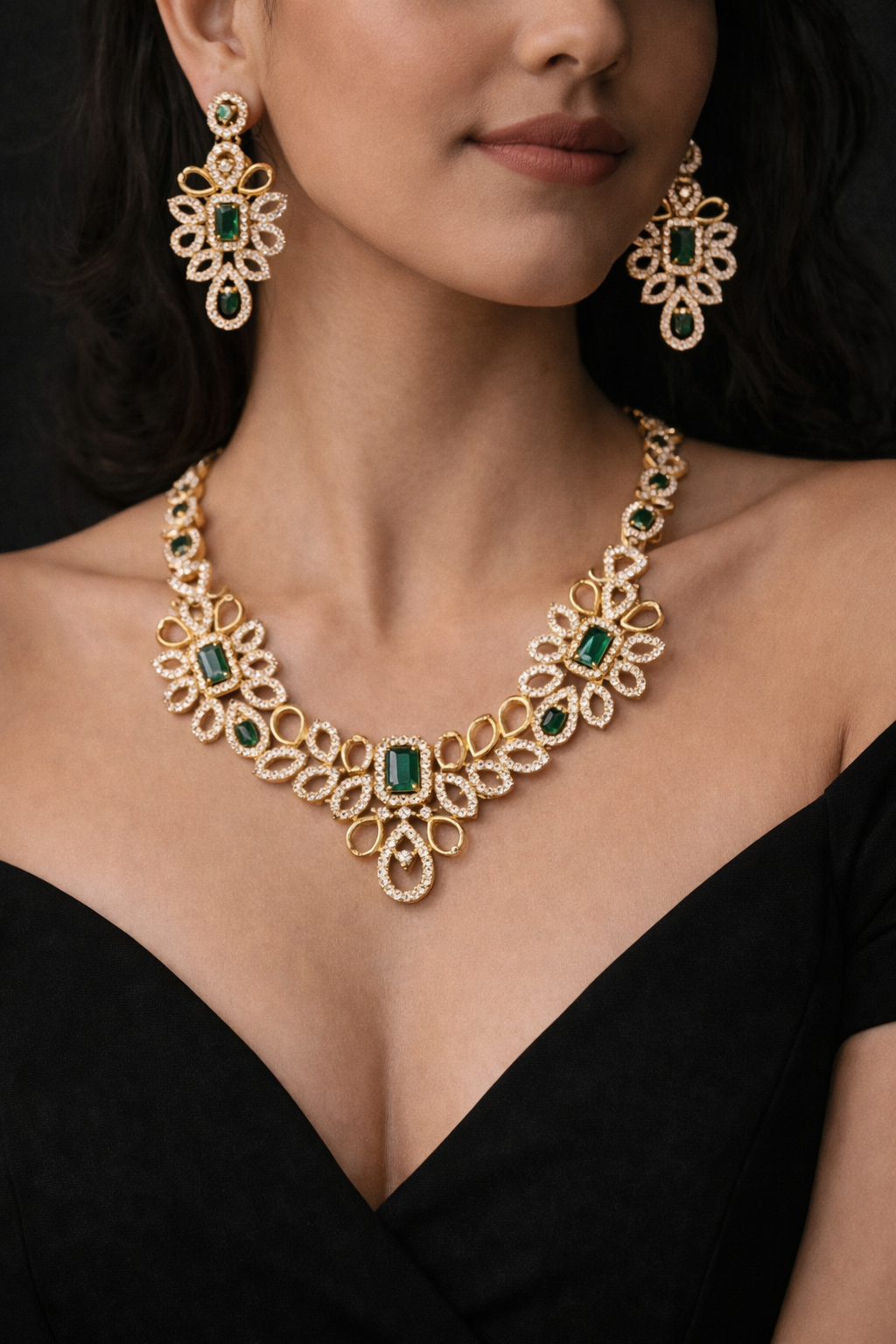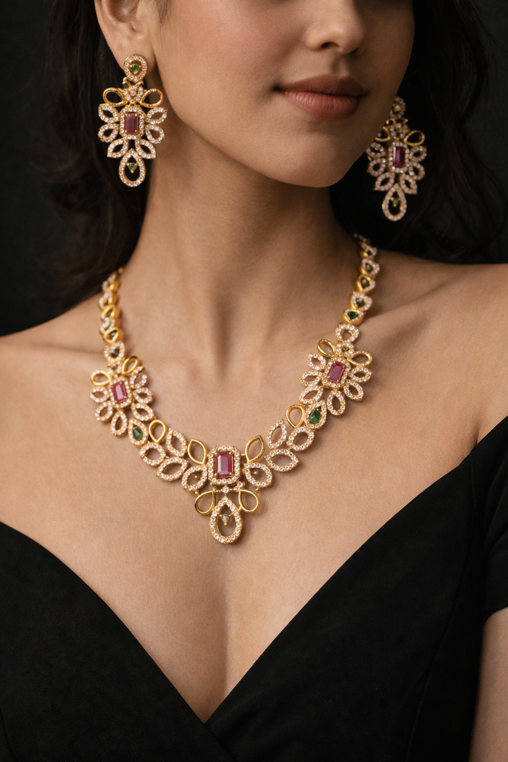 Elevate your festive and party look with Nexli’s Floral Elegance American Diamond Necklace Set, designed to deliver timeless charm with a luxurious finish. This beautifully crafted set features an intricate floral-inspired design, highlighted with high-quality American diamonds and elegant stone detailing that adds depth and sophistication.