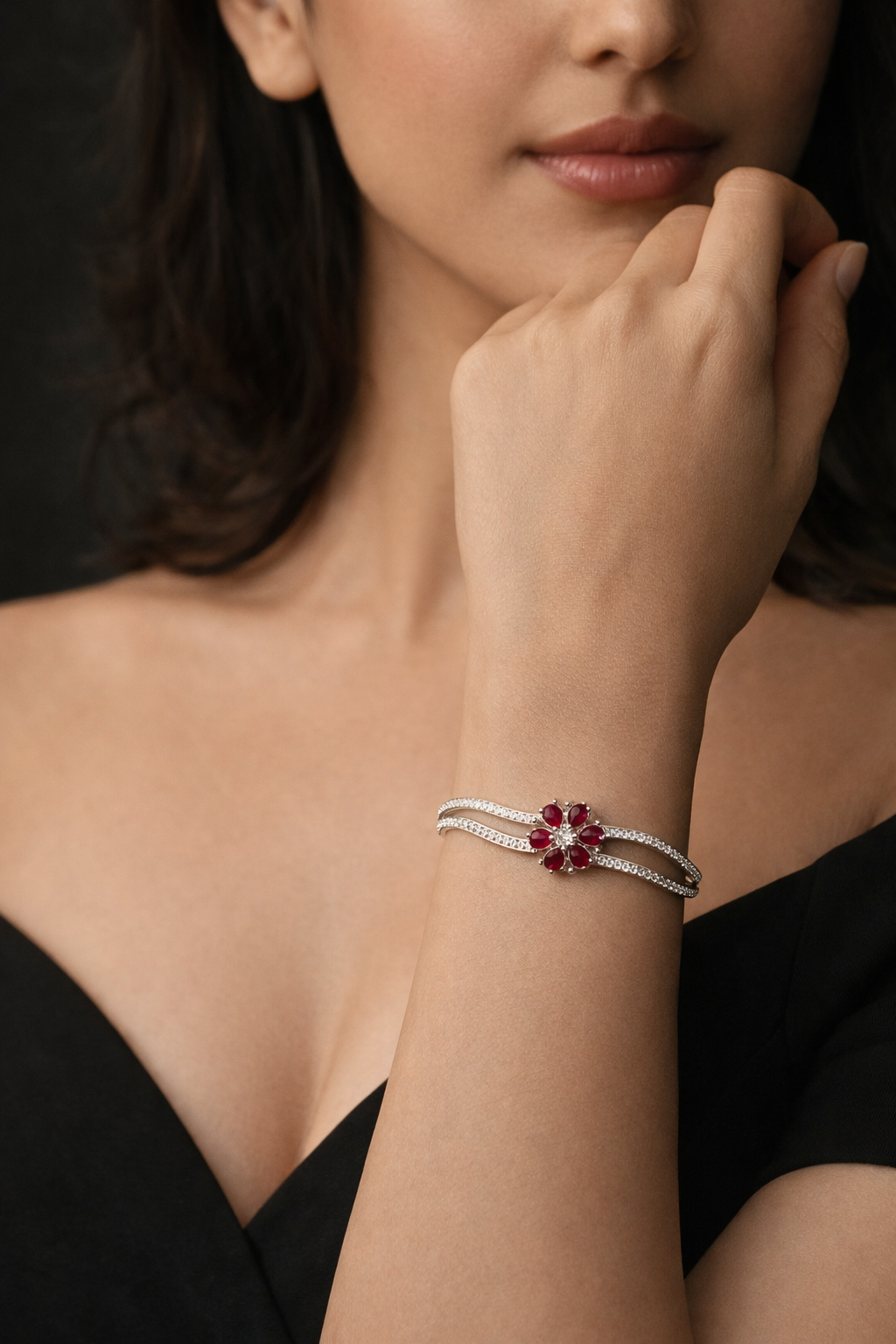 The Nexli Crimson Bloom Bracelet is crafted for those who appreciate refined elegance over excess. Designed with a graceful twin-band silver-tone structure, this bracelet is highlighted by a floral centerpiece set with deep red stones and shimmering American diamonds.