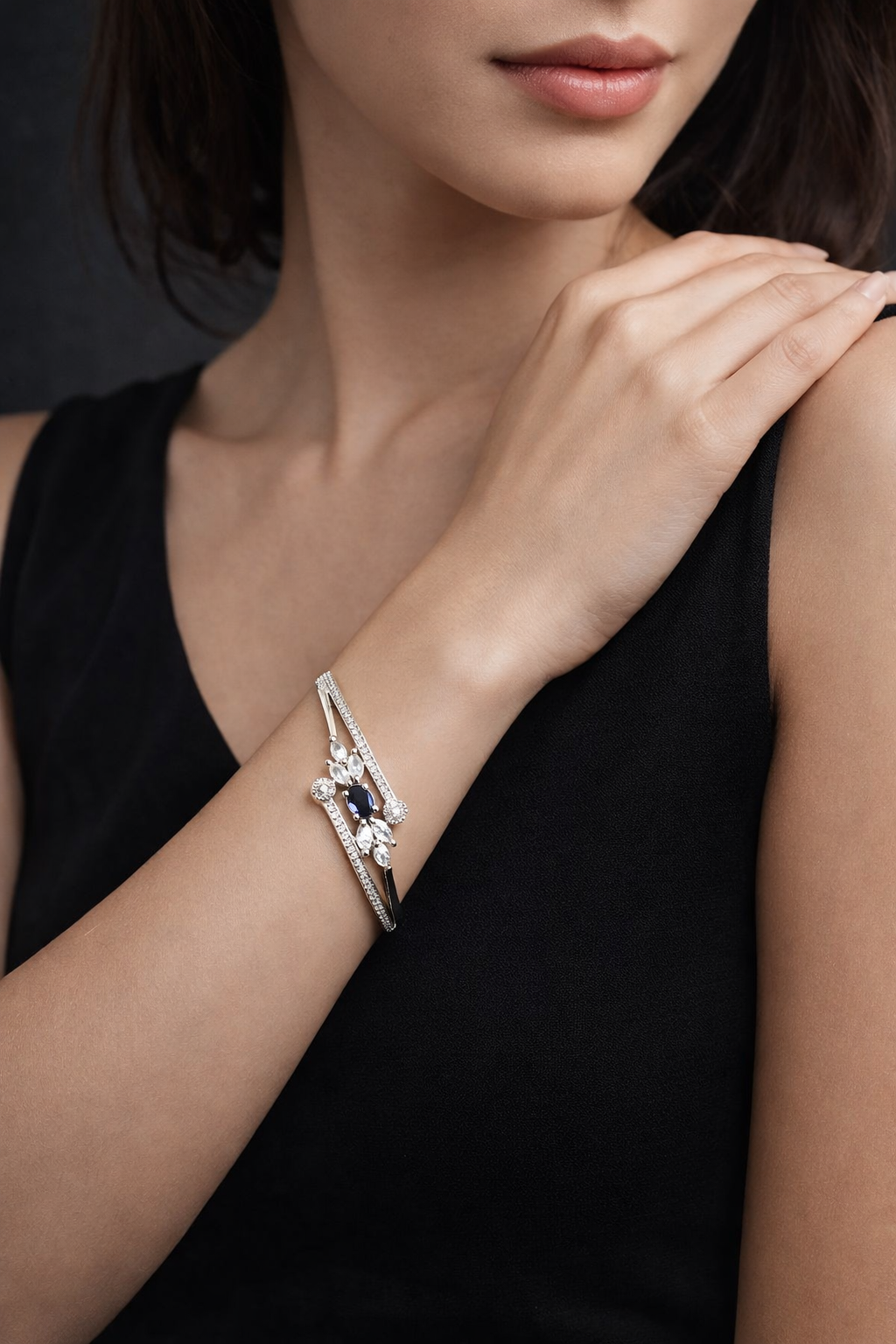 The Nexli Midnight Bloom Bracelet is crafted for those who appreciate subtle luxury. Designed with a sleek open-frame structure, this bracelet highlights a deep sapphire-blue stone at the center, surrounded by finely set American diamonds that add brilliance without overpowering the design.