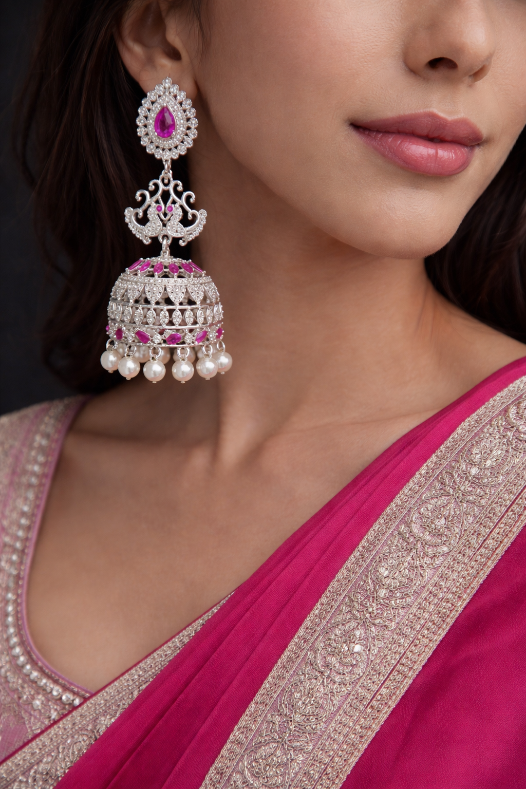 Make a powerful style statement with Nexli’s Ruby Silver-Tone American Diamond Bridal Jhumka, designed for women who prefer modern elegance with traditional depth. These jhumkas feature a detailed silver-finish structure encrusted with high-brilliance American diamonds, complemented by striking ruby-pink stones that add richness and contrast.